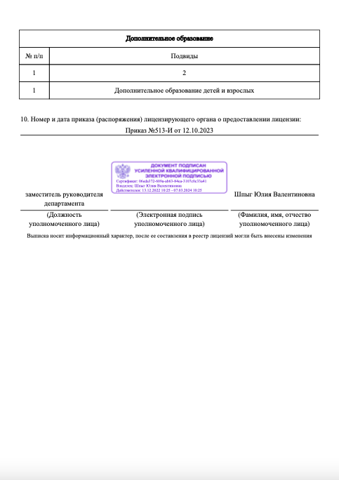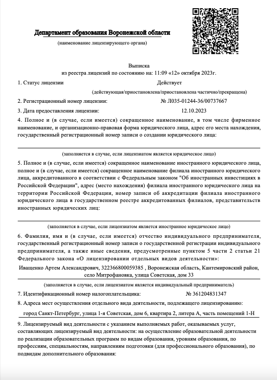 Лицензия на осуществление образовательной деятельности No Л035-01244-36/00737667 от «12» октября 2023 года, выданная Департаментом образования Российской Федерации